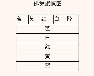 又在這次會議,討論關(guān)于佛教旗幟的規(guī)定:即根據(jù)佛陀成道時,圣體放出六種色光,來制成佛旗:1.藍色,2.黃色,3.紅色,4.白色,5.橙色,6.前五色混合色。如圖: