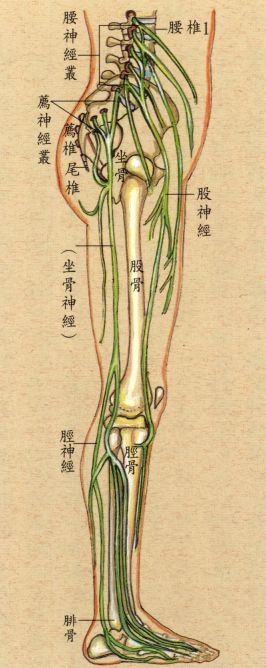 (五)、由腰椎、薦椎出來之‘神經’,如坐骨神經、腸下腹神經....(見下圖)會受壓迫,產生種種癥狀。平日姿勢,腰塌前太甚者,常患‘坐骨神經痛’,及下腹部疾患。