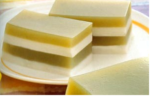 2,將材料(3)中的抹茶粉用少許冷水調拌開來,再與其余材料(3)混合,置于爐子上邊煮邊攪拌,帶沸騰時,快速攪拌至弄抽狀且呈透明色,即可以關火3,待圖一凝結了,就倒入圖二,待凝結,即可以食用,食用時切塊!