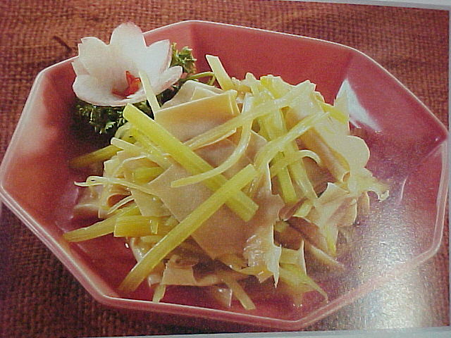 1、百頁切長(zhǎng)5公分,寬3公分的薄片,鍋中加清水1公升,下堿水1茶 匙,煮滾后,放入百頁,采取浸泡的方式泡12分鐘,用手試摸,當(dāng)顏 色變白,質(zhì) 感滑細(xì)時(shí)撈出,再加清水煮滾1次,完全洗凈堿味,滴干水分,備用。 2、將姜磨成姜茸。 3、芹菜切5公分長(zhǎng)絲,放入滾水中汆燙一下,撈出后和已處理好的百頁, 姜茸及調(diào)味料拌勻即可。