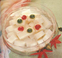 鋁鍋放清水1250克,加洗凈的瓊脂燒沸,置小火上煮15分鐘,使瓊脂溶解。將兩種杏仁用沸水浸透、去膜、搗碎,然后加水250克,反復搗成泥,用沙布濾取汁水攪勻。將瓊脂溶解倒入鋁鍋,置小火上,杏仁汁徐徐淋入鍋內,充分攪勻(不能太稠或結塊),燒至90℃左右時)速將混合液裝在10克糖瓷碗內,使其凝結,即成“杏仁豆腐”,加蓋后放入冰箱,冷藏待用。白糖放在鋁鍋內,加水5000克,熬成糖水撇去浮沫,冷卻后用篩過濾,裝入潔凈的瓶內,冰凍待用。吃時,先把冰糖水1分倒在荷葉碗內,取出杏仁豆腐,用刀切成0.2厘米厚、2厘米左右見方的薄片,整齊地倒入糖水碗中。