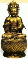 傳說瓶內盛凈水,象征凈化身心。觀音遍瀝甘露法水,令眾生了悟菩提,代表慈悲為懷,普瀝佛法。觀音是中國佛教的四大菩薩之一,其道場在浙江普陀山,據說其生日在夏歷二月十九日,成道日在夏歷六月十九日,涅槃日在夏歷九月十九日,屆時皆舉行盛大法會。觀音為阿彌陀佛的左脅侍,“西方三圣”之一,佛教將其描寫為大慈大悲的菩薩,極受中國信徒的偏愛,因此觀音菩薩也是受中國本土化改造最多的佛教神。觀音原為男性神,后來逐漸被中國信徒改造成女性神,向世俗化方向發展,向民間發展,使信仰觀音的人越來越多。女相的觀音造像大約始于南北朝時期,唐以后逐漸盛行,在現存的中國寺院中供奉的觀音塑像,通常都是女相。明代銅佛像的鎏金,多采用“瀝金”工藝技巧,使鎏金層勻厚、亮澤,不易脫落。明代的鎏金觀音像大都垂目微笑,突出智慧圓通,造型穩重。