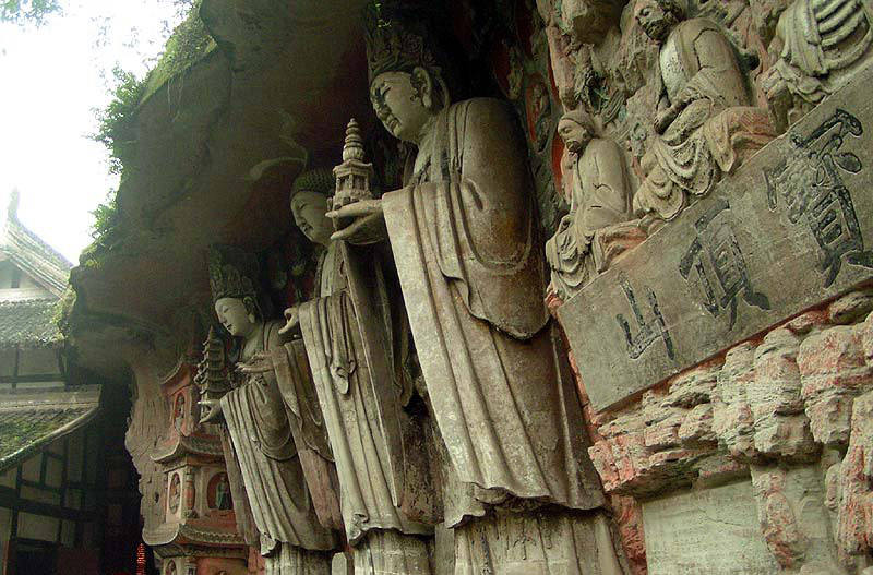 我國的佛教造像進入隋唐,是發展極盛的時期,此時造像受我國傳統思想藝術理論影響,融合印度造型藝術,向著現實主義的民族形式向前發展,開始出現了形象逼真、造型優美、豐滿端莊、褒衣薄帶的中國式的佛、菩薩造像。佛教造像日趨世俗化和生活化,富于人間生活氣息,到了唐末宋初更趨于成熟與完美。雕鑿于唐末宋初的石鐘山石窟第四號窟華嚴三圣雕刻就是這一時期的成功之作。第四號石窟的華嚴三圣雕刻體現了南詔、大理國時期西南地區各民族人民高超的雕刻藝術水平與豐富精湛的藝術內涵。使我們得以窺視到古人創作石雕造像時鮮活的形象,讀到形象里承載的美麗,也才得以使我們對那個偉大時代做著自已的猜測和遙想。