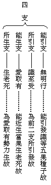 十二有支,在遠近因果,和已潤未潤的因果關系上,諸支相望。《緣起經》、《瑜伽論》、《對法論》、《成唯識論》等,皆略攝為四支:一能引支、二所引支、三能生支、四所生支。