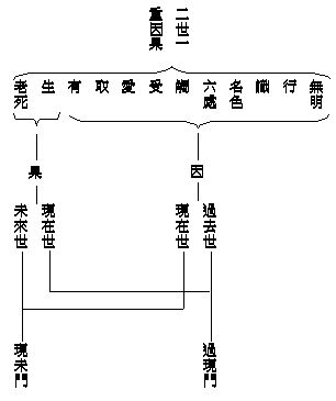 《大乘唯識論》中,于十二有支唯立二世一重因果。十二支中,前十支是因,后二支是果,這前十因支,與后二果支,定不同世。以十二有支是約分段生死的異熟因果來說的,異熟因非造業之身即可受果。既然異熟因果是約有情身生死以為世,故因果支定不同世。以造因時非即受果時故。亦非現業得果可以是十二支故,但十支因中,前十支與愛、取、有三支,可以異世,可以同世。若順生受的業(即下一生)其世必同;即現世身中由無明發業,熏成