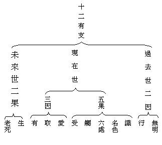 總上所說十二有支,在小乘一切有部論中,都是以五取蘊為體,建立為三世兩重因果。無明、行兩支,是過去世的惑業,為招感現世識等五支果法的因,故無明行是過去二世。識、名色、六處、觸、受,是由過去世無明行所招感的現在世的五支果法,故識等五支,是現在五果。這是一重因果關系。愛、取、有三支,是現在世的因,愛取是煩惱,有是業行,現在世中由愛趣有起惑造業,為招感未來世苦果的因,故愛取有三支是屬于現在世的三因。生老死二支,是由現在愛取有決定招感的屬于未來世的苦果支,故生老死是未來的二果。這又是一重因果。如是十二有支,就成為過去、現在、未來,三世兩重因果。列表如(表四十三):
