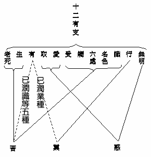 若細分別,無明愛取三支是惑所攝,行全支及有支一分是業所攝,有支中除識等五種,以非業故。識等五和生老死共七全支,及有支中一分,即已潤的識等五種,是苦所攝,如《成唯識論》說:‘惑、業、苦三,攝十二者,無明、愛、取,是惑所攝。行、有一分,是業所攝。七、有一分,是苦所攝。’立表如(表四十六):