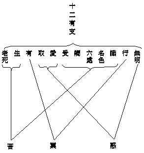 (三)無色界:無明支中,唯有勝義愚,有覆無記性。行支中,唯有不動行,唯有意業。識支,唯是化生天趣。名色支中,唯有名無有色。名中又無五識。六處支中,唯有意處。觸支中,唯有俱相違觸。受支中,唯有舍受。愛支中,唯有有覆無記性。取支中,概攝一切煩惱,在根本煩惱中,唯有九種,除去嗔心。隨煩惱中,除小七(忿、恨、覆、惱、嫉、慳、害)中二(無慚、無愧)是不善性,唯欲界有故。誑、諂通欲界及初禪,憍及大八通三界。故隨煩惱中,唯有憍及大八。有及生老死,準色界可知。