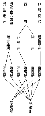 十二、三斷門:十二有支,一切皆通見修二道斷,不通不斷??偲饋碚f,諸惡趣業果及無想定、無想天、半擇迦身等有支,皆見道所斷。彼等唯是分別煩惱發起,故入見道時一切皆斷,有漏善業及無覆無記的若現若種諸有支,皆修道所斷。又斷有三種:(一)自性斷,即諸煩惱及彼相應的諸心心所不善性,和有覆無記染污性法,是自性應斷者,見修二道生起現行時,彼即永斷。一切有漏不染污的善法,和無覆無記法,非自性應斷,體非暗法,不違圣道故。(二)離縛斷,即斷除能緣有漏善無記法的煩惱纏縛,能緣心不為所緣善無記法纏縛,說名離縛斷,即前所說一切有漏善法和無覆無記法是離縛斷。(三)不生斷,斷彼所緣因,令果永不生起,即由因斷故,果法不生,是名不生斷。如諸惡果異熟趣體,及無想定、無想天等,由圣者見道時,彼等惑業因斷故,彼等果法永不得生,故名不生斷。此亦包括前說善無記法之一分。在上三種斷義中,大概地說,十二有支的無明、愛、取三支染污性故,是自性斷,亦即通見修斷。雖然亦通離縛斷位不生斷,以弱故不說。行、有二支,通自性、離縛、不生三斷;亦即通見修所斷。染污性的自性斷,非染污的通不生斷和離縛斷。若行支中的善業,及有支中的識等五果無記種子,即通離縛斷和不生斷,不生斷即是見道斷,離縛斷即是修道斷。識等七支,唯通離縛斷和不生斷,體非染污,故不屬自性斷。即識等五果種及生老死既是無記法,其通不生斷的,即是見道所斷,如惡趣異熱果及女人身等,唯是見道不生斷。其通離縛斷的,即是修道所斷,如人天異熟果,唯是修道離縛斷。立表如(表四十七):