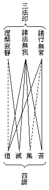 這三法印,是苦集滅道四諦變相的收攝,諸行無常,是苦諦;其生苦之因即集諦;涅槃寂靜即滅諦;其證滅之因即道諦。無我則貫通四諦。如《大智度論》二十二卷說:‘佛說三種實法印,廣說則四種,略說則一種。無常印是苦諦、集諦、道諦說。無我則一切法說。寂滅涅槃,即是滅諦?!⒈碇ū硭氖耍?/DIV>
